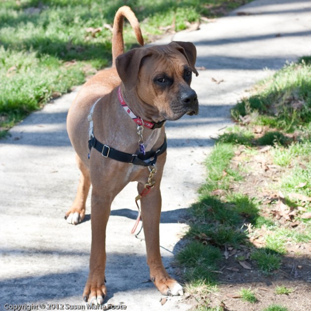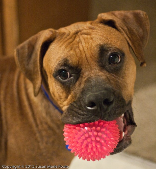 I find his breed adorable. I know that sounds funny, but it’s how I think about it. I call him an All-American Mix breed. He’s definitely got some Boxer in him with the way he looks, the point on the top of his head and the way he throws those paws all around when he’s playing. Those massive paws and the way he looks when he’s sitting proud on the couch shows off his Mastiff side. And the way in which he keys in on birds during our walks makes me wonder if there is some Pointer in there somewhere. With recent warmer temps Rex’s panting has brought out a beautiful Pittie smile – a big pink tongue and all.