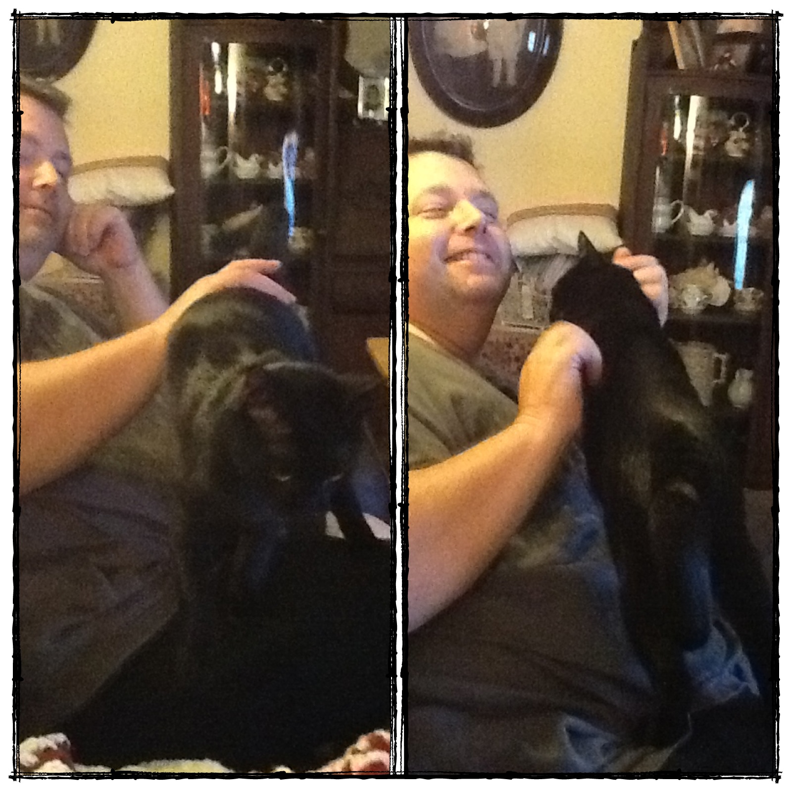 Tic Tac is a black domestic short hair with beautiful green-gold eyes. He’s three years old and although lanky is solidly built. He is brave and friendly. He came right out of the cat carrier when we opened it up in the dining room and started exploring the house. He likes to have his head and neck rubbed and will give you a head butt to get that affection. Actually, his head butts are one of the funniest things he does – it’s unlike any cat head butt I’ve experienced. He will actually smash his forehead into the middle of your face and just hold it there. Loud noises like metal pizza pans crashing to the kitchen floor do not send him running – it also struck me as I gathered up the grocery bags yesterday as I was used to Spice streaking from the room any time you rustled a plastic bag. It took no time at all for him to lounge between Charlie and me whether we were on the couch or in different rooms. He is definitely Charlie’s cat as when we’re hanging out on the couch Tic Tac is cuddled up next to Charlie – I’m so jealous! Although at night, TT curls up at the foot of the bed leaning against my legs.