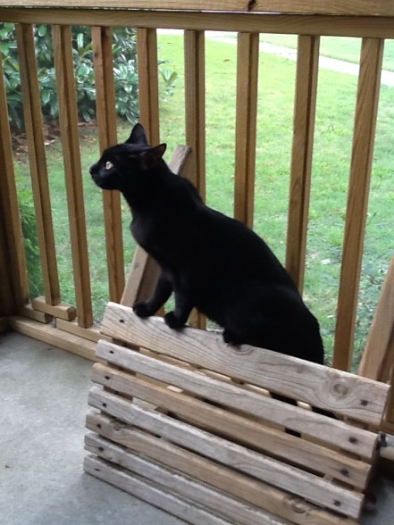 It happened so quickly I’m not even certain what all took place. There was some screeching. I saw Tic Tac below Ruffus’ head and then Tic Tac jumped up on the corner table and there was a whole lot of hissing. Since then Tic Tac keeps a low profile when Ruffus is out and about the house. The whole incident seems to have heightened Ruffus’ prey drive where Tic Tac is concerned ‘cause once he catches sight of Tic Tac there is no re-directing his attention.