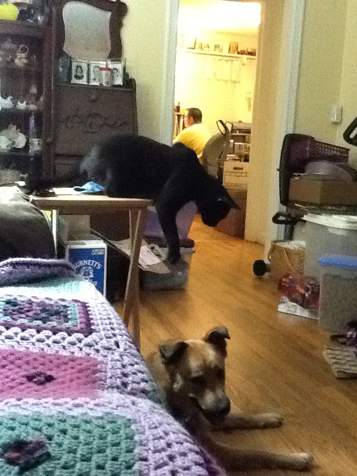 I sat down on the end of the couch nearest the mat while Tic Tac decided that very moment in time that he needed some freerunning. He raced from the living room to the dining room and back. Ruffus stood in his path back and Tic Tac, being the parkour kitty he is, went to vault himself over his doggy obstacle using Ruffus’ big head as a launch pad. Well, Ruffus just tipped his head back and brought Mr. Tic Tac down.