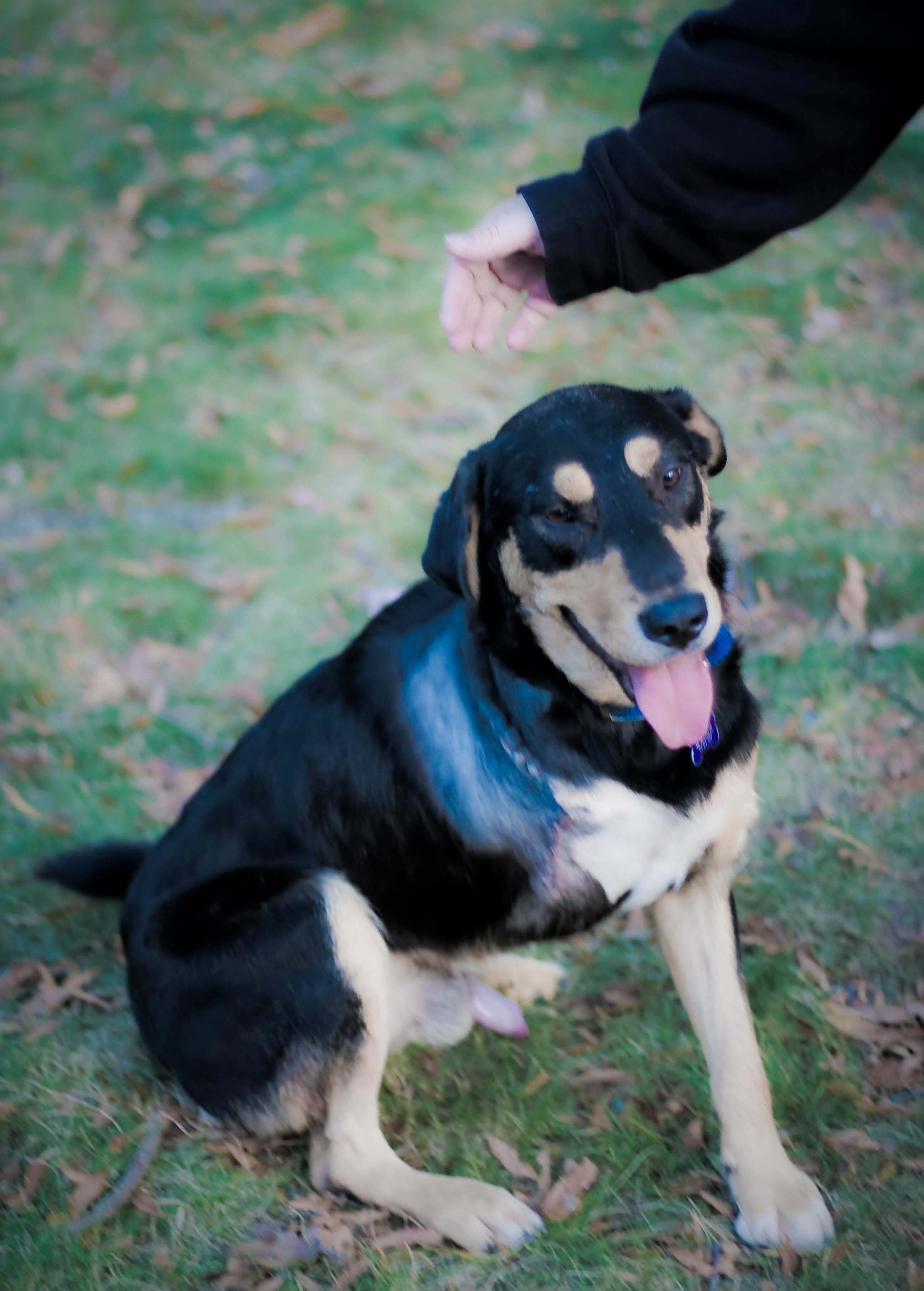I’m a Black and Tan (hey, maybe my name should be Guinness) Rottie mix. I’m a little over a year old and I weigh about 60 +/- pounds. Oh, I only have three legs.