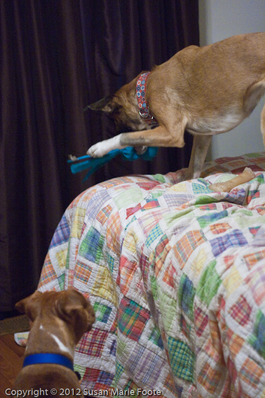 So even if we’ve been out at say, 3:00 AM, at about 5:30 or 5:45 all three of them, Ruby, Kay Kay, and Tic Tac, conspire to start the day. Really, Tic Tac starts it by using the underside of the bed as a scratching post, which gets Ruby bouncing around going after him – at which point all three are just restless and having wrestling matches on top of me.