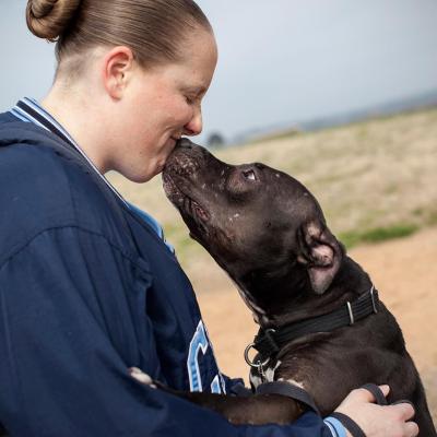 Like most Pit Bull mixes this three-year-old girl longs for nothing more than a loving human touch. She lives for those moments where she can sit in your lap, lean against your leg or reach up for a hug and an ear scratch. She’s also a happy little walker who does well on a leash and will even take the leash and walk herself if you get tired.